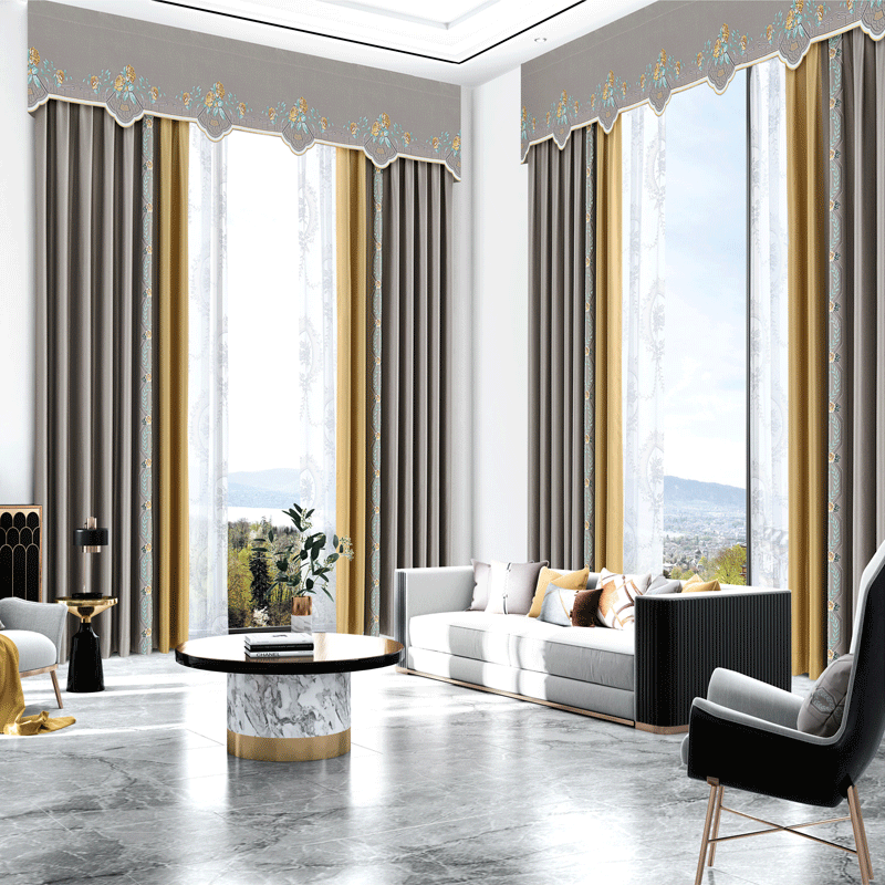 一朝異夕 成品垂直定型簾,垂美優雅,黃金等寬褶皺,經久耐洗。高精密工藝,絲綢質感,無縫拼接工藝與繡花結合,花型優雅柔美,面料順滑。色彩搭配舒適,黃色搭配淺咖灰色,加上繡花花邊,盡顯優雅女性。